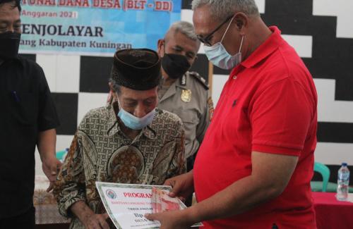 Penyaluran Bantuan Langsung Tunai (BLT DD) di Desa Tenjolayar Kecamatan Pancalang, di hadiri langsung oleh Bupati Kuningan, H. acep Purnama, SH., MH. di dampingi camat Pancalang, Deni Komara, S. IP, M. Si. , Jum'at (30/7/2021).